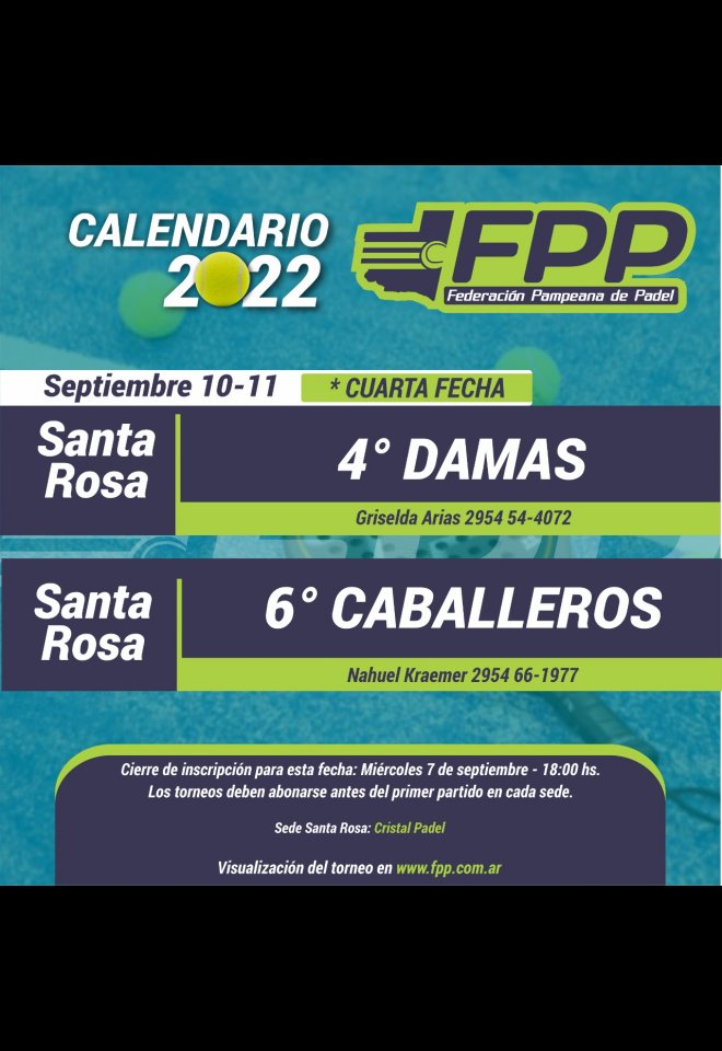 »» Evento: 4TA ETAPA 4TA DAMAS - 6TA CABALLEROS »» Localidad: Santa Rosa »» Fechas: 10/09/2022 al 11/09/2022